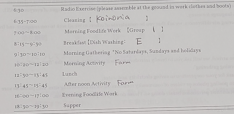 After cleaning, we head out for our morning work. Groups usually gather near the main entrance and leave from there. Before breakfast, the work is usually food-life work on the farm, as I mentioned earlier. If you have already worked very early in the morning, some tasks may be skipped, so the schedule can change from day to day.